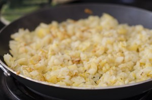 Easy add fresh potatoes or a bag of hashbrowns to a large frying pan, and bown with a little cooking oil.